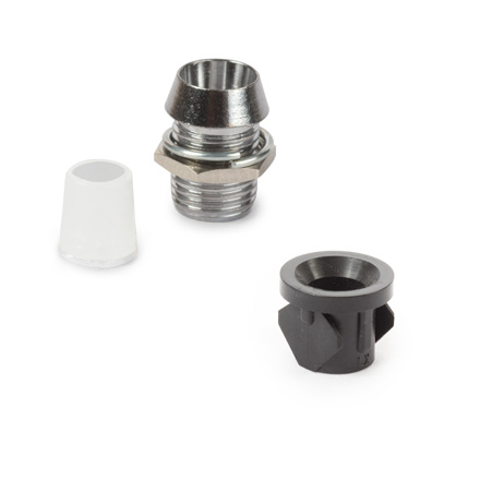 Press-fit holders for mounting our 5mm LEDs. The LED is held in place by the leads from behind, or with a dab of silicone caulk.