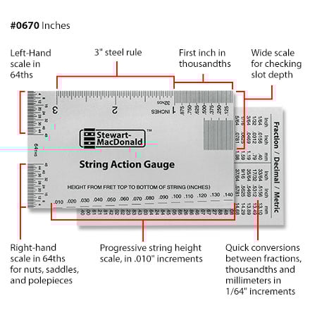 Included in the trio is our String Action Gauge, a must-have for measuring the height of strings, nuts, saddles, and pickup polepieces. Designed specifically for stringed instruments, it's faster and more accurate than a standard ruler, allowing you to dial in the perfect setup for your guitar or bass.