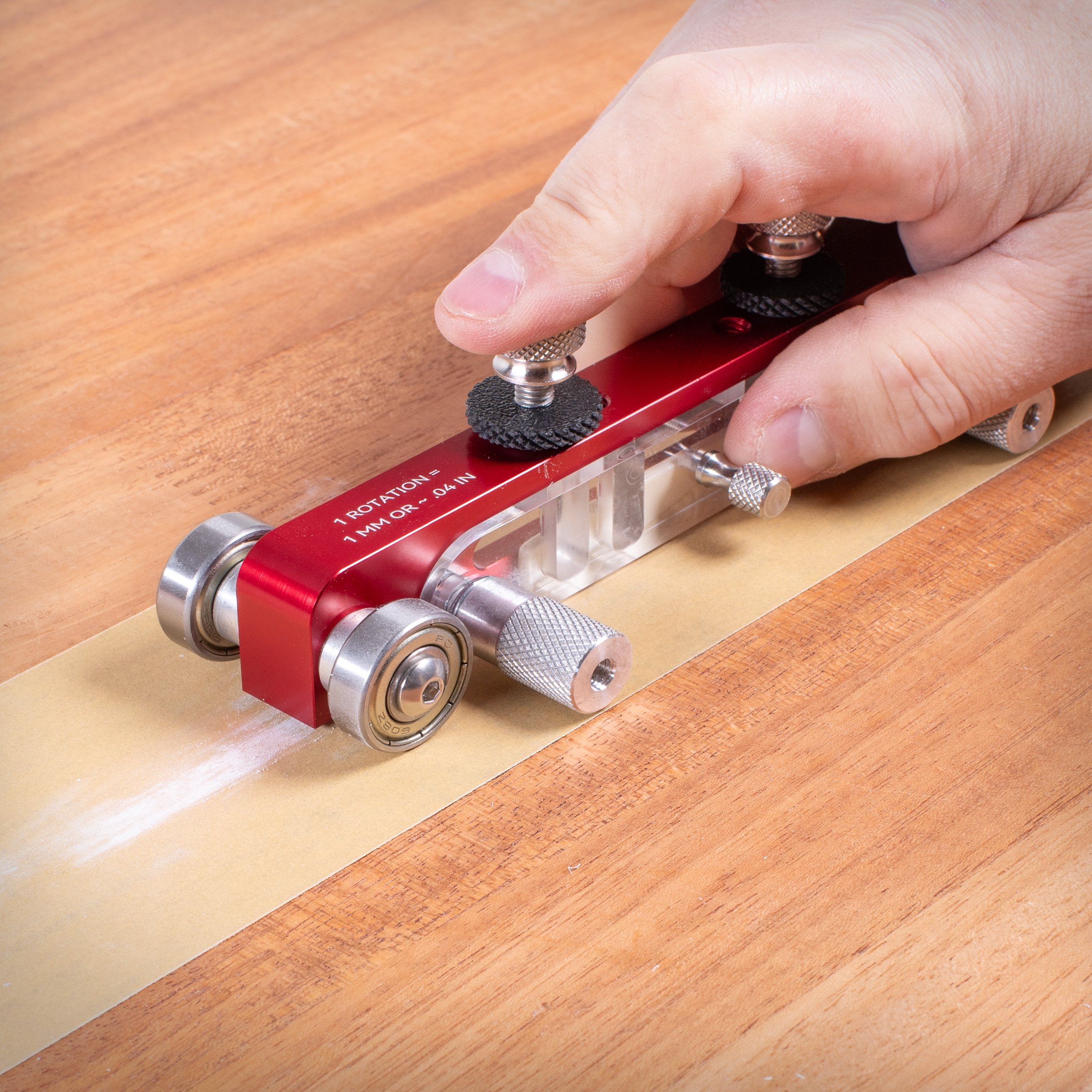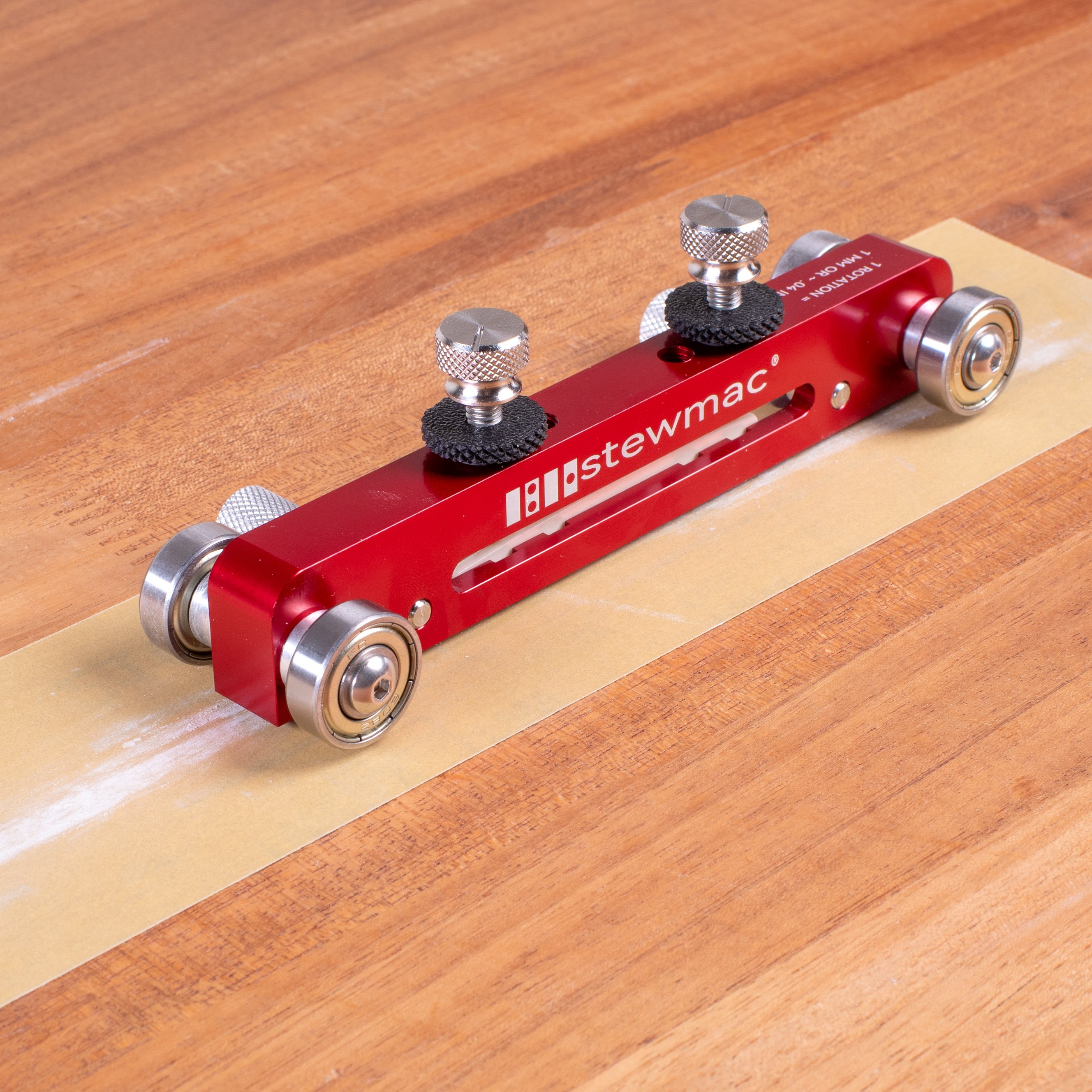 The new and improved version of our original features a red anodized aluminum body built for a lifetime of use in your shop. A semi-transparent side makes it easy to align your nut or saddle before sanding, and a built-in reference scale shows exactly how much material you're removing with each turn of the adjustment knobs.