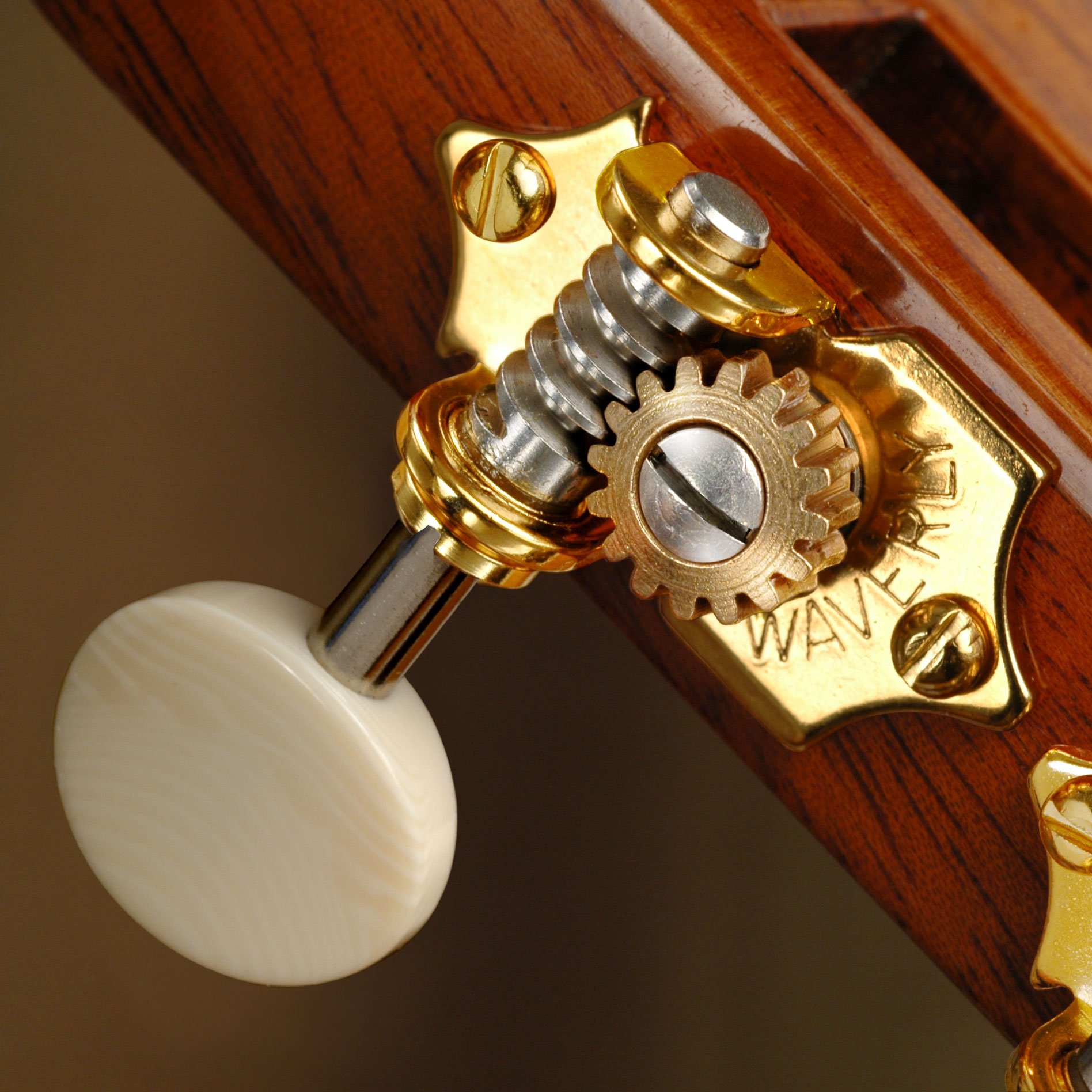 With Waverly tuners, your guitar plays in tune and stays in tune. Waverly's patented design combines stainless steel with bronze to create smooth, non-slip tuning. The perfect replacement tuners for valued instruments, Waverly machines are handmade to fit precisely without drilling on older Martin and Gibson guitars. Manufacturers such as C.F. Martin, Gibson, Collings, Santa Cruz, Huss & Dalton, Sams, and Bourgeois choose Waverlys for their finest instruments.