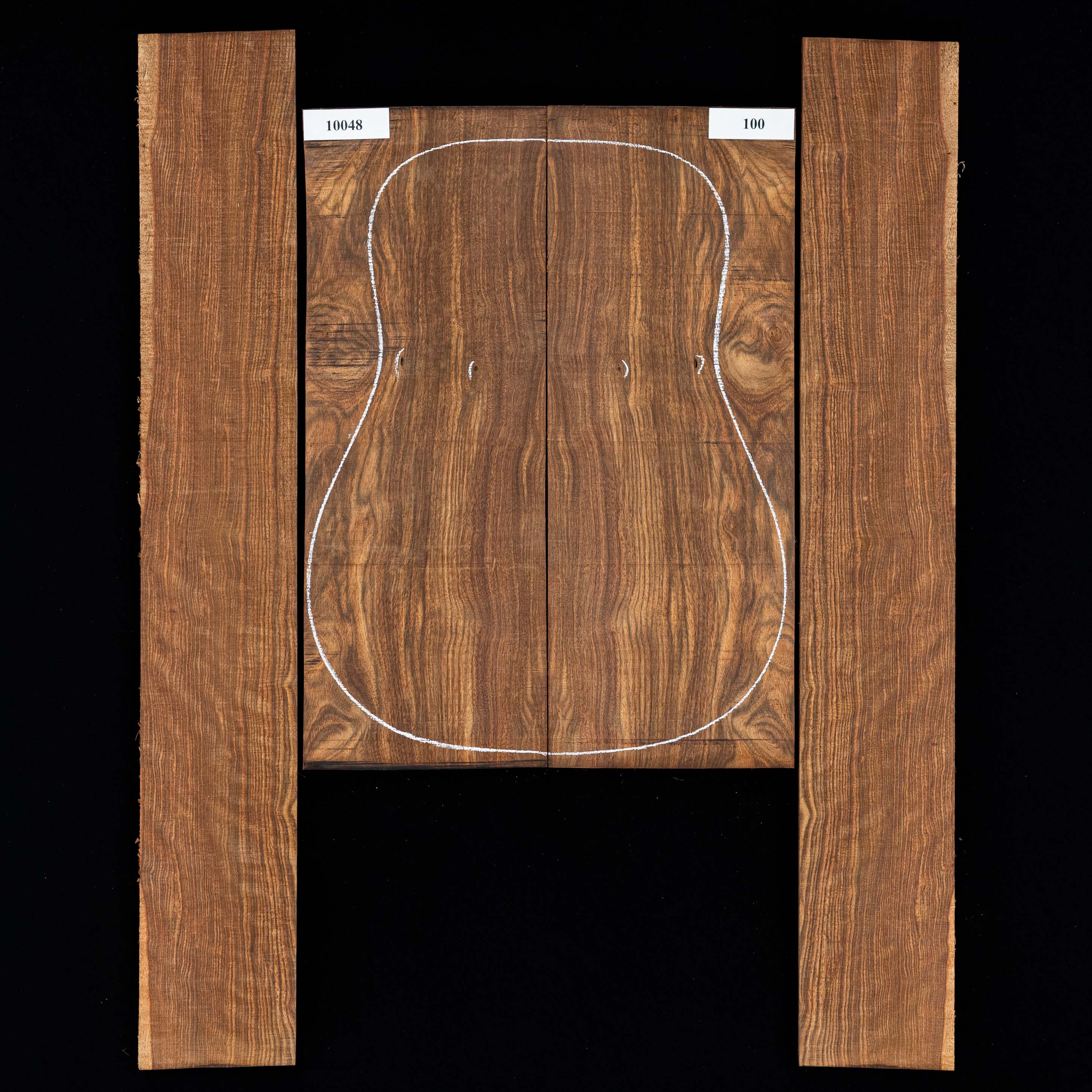Each bookmatched back and side sets are ready for you to start your build. When joined, they are large enough for a dreadnought. Sides are unprofiled (rectangular) and unbent. Kiln-dried.