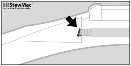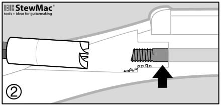 Some Fender necks have a bullet truss rod nut at the peghead. These have a slightly narrower truss rod cavity. To center the wood cutter on these, we provide a brass pilot bit. Inserted in the cutter, this pilot keeps the cutter centered until the cut is well started; after that you can remove the pilot and continue cutting normally.
